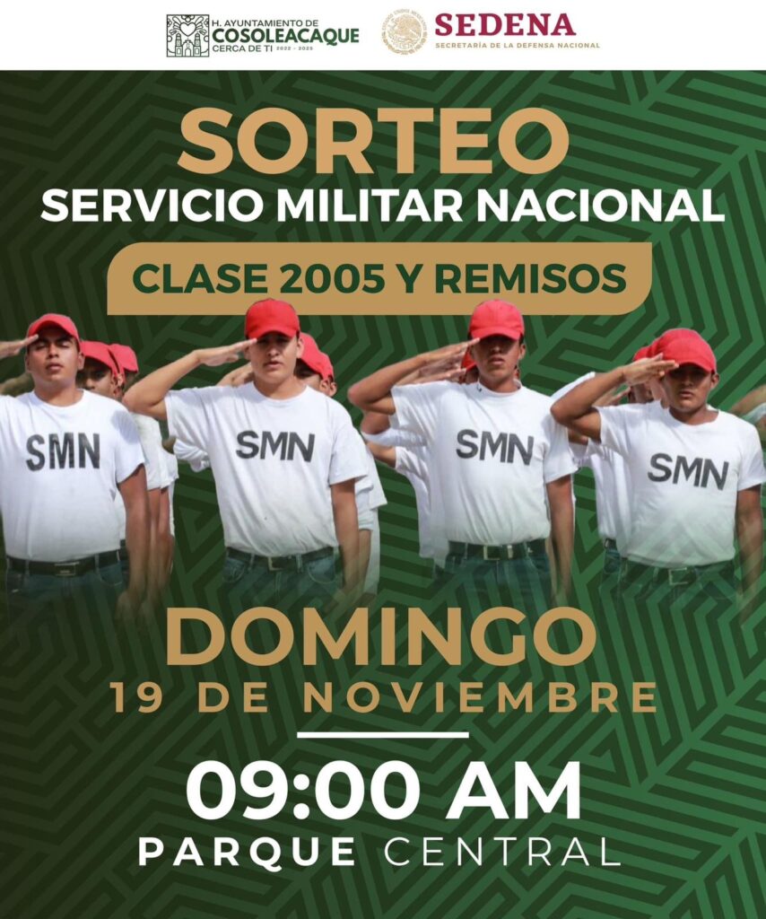 Cosoleacaque, Ver., 15 de noviembre 2023.-El H. Ayuntamiento de Cosoleacaque y la Secretaria de Defensa Nacional (SEDENA) realizará este domingo 19 de noviembre, a las 9:00 horas, el sorteo del Servicio Militar Nacional (SMN), clase 2005 y remisos, en el parque central Miguel Hidalgo.