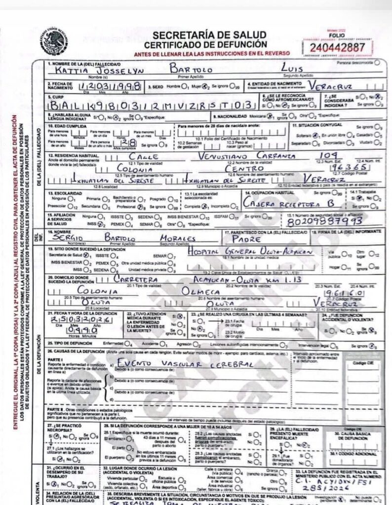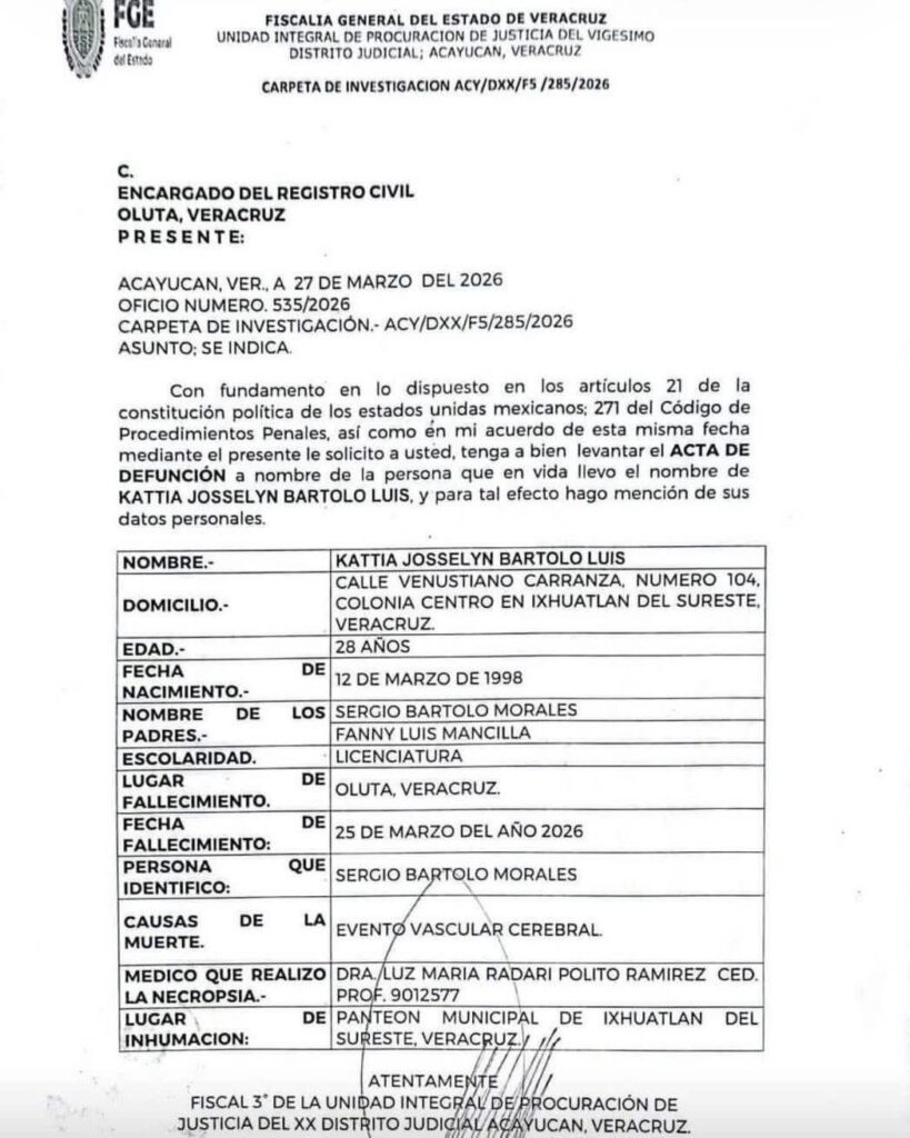 Cortesia/JV/ Acayucan, Ver.— La muerte de una trabajadora de caseta en el sur del estado escaló hasta la agenda estatal. La gobernadora de Veracruz, Norma Rocío Nahle García, instruyó reforzar la comunicación entre la autoridad ministerial y la familia de Kattia Josselyn Bartolo Luis, empleada de Caminos y Puentes Federales (CAPUFE), fallecida en la caseta de cobro de Acayucan.